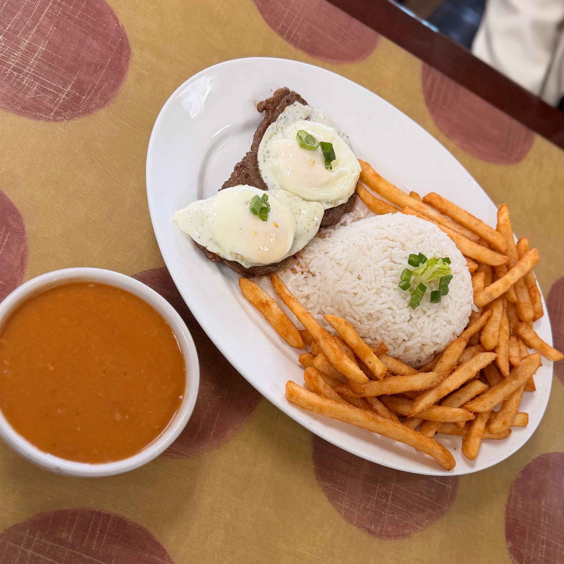 Grilled Beef Cutlet Thin Sliced Served Topped with Two Eggs, White Rice, Beans & Fries